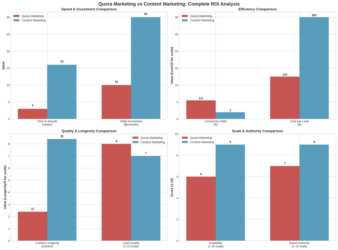 💡 Key Insight: Quora marketing typically delivers faster, higher-converting leads, while content marketing provides broader reach and longer-lasting results.
