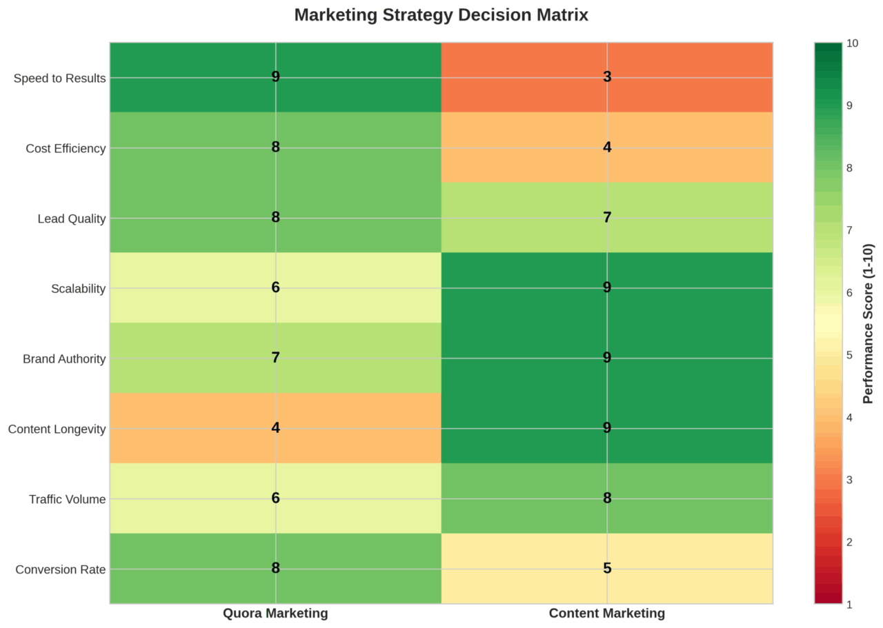 💡 Key Insight: Quora marketing typically delivers faster, higher-converting leads, while content marketing provides broader reach and longer-lasting results.